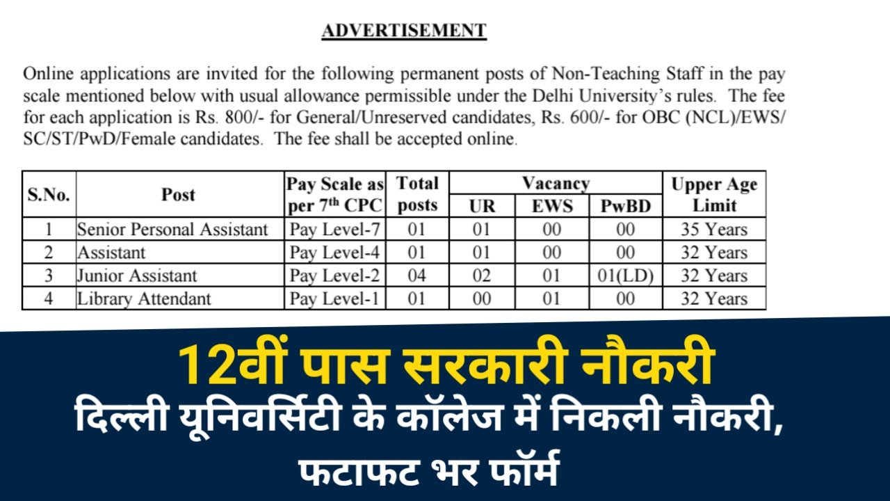 अगर आप दिल्ली में सरकारी नौकरी (Government Job) की तलाश कर रहे हैं, तो आपके लिए बड़ी खबर है। दिल्ली विश्वविद्यालय के अंतर्गत आने वाले दयाल सिंह इवनिंग कॉलेज ने नॉन-टीचिंग (Non-Teaching) पदों पर भर्ती का नोटिफिकेशन जारी किया है। इस भर्ती के तहत 12वीं पास से लेकर ग्रेजुएट उम्मीदवारों को आवेदन का अवसर दिया जा रहा है।